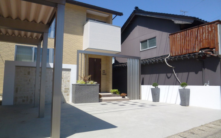 お家の色が白とベージュでどうしても2色を使用したかったのでカッコよく見えるベージュ色(名古屋モザイク)のタイルを選択し白い目隠し塀のポイントに。