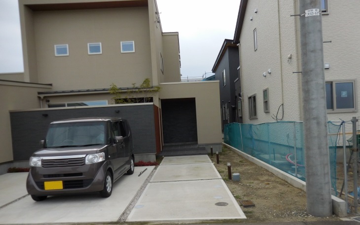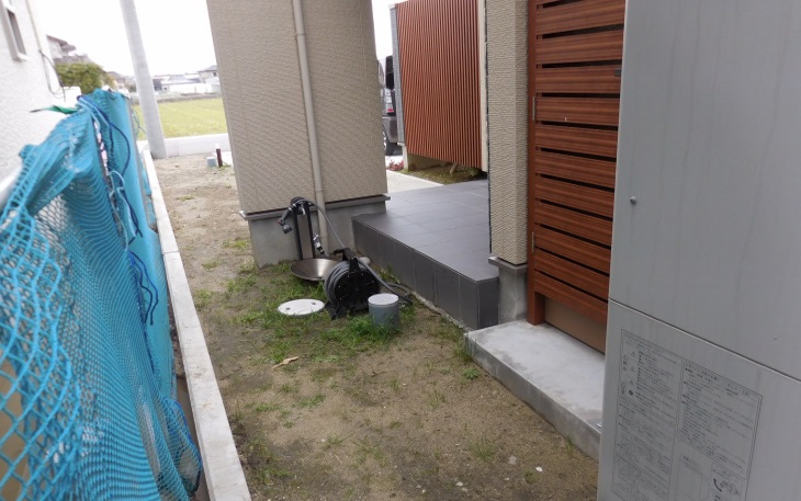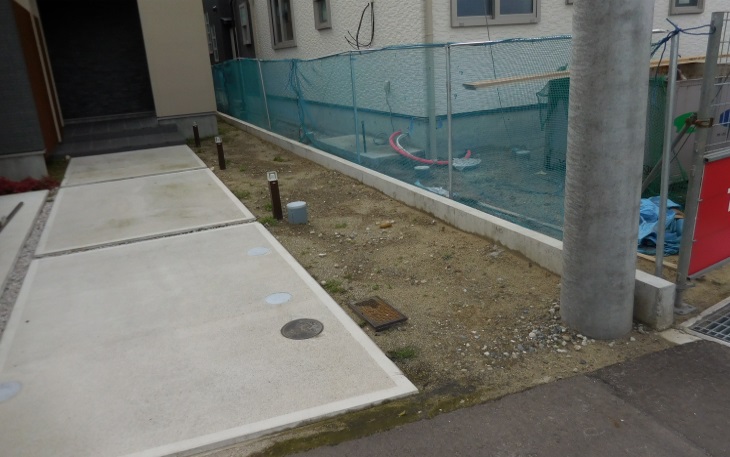 隣地の建築がはじまり、K様のアプローチ及び玄関前から隣地の設備機器が見える状況となってしまい隣地との境界塀の設置のご依頼です。