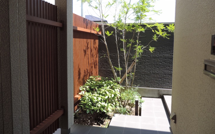 玄関横も隣地からの目隠しの花壇&立木を設け、ミニテラス的な一つの空間となりました。