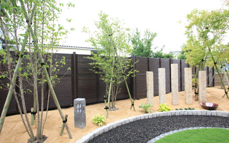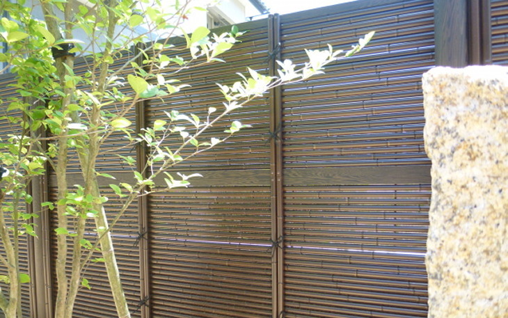 お庭側の境界には目隠しも兼ねてタカショーのeバンブーユニットの御簾垣を。色は虎竹を選択しました。