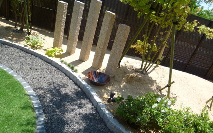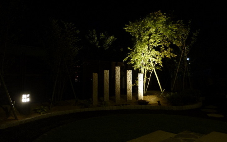 お庭の中心には省管理型高麗芝をサークルで張りました。お庭全体に敷いた黒の化粧砂利が緑をいっそう濃く見せてくれています。
