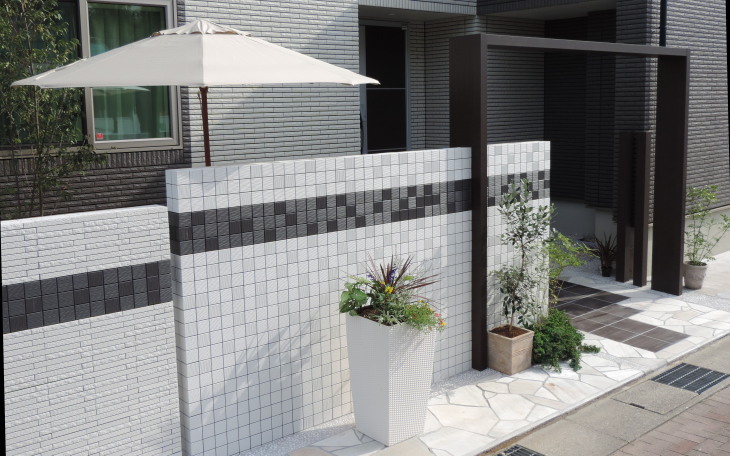 塀は両面タイル貼 名古屋モザイク エステアとキプリアを使用しています