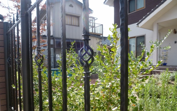 駐車場から玄関に向けての入口には鋳物フェンスにあわせて片開き鋳物門扉 LIXIL『アイアンティーク門扉SB型』を取り付けています