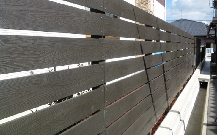 南、西側はH1.5Mの軽量樹脂ルーバーでしっかり目隠し、回覧板などが入るポストをルーバーに埋め込んで、歩道に行けるように軽量樹脂の鍵付オリジナル門扉も設置しました