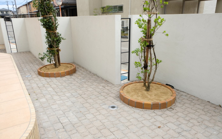 お庭の床面は 明るさと雑草対策も兼ねた床材を使用