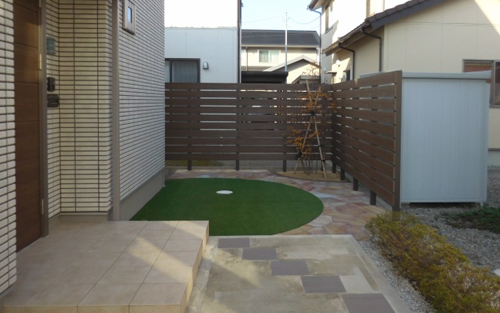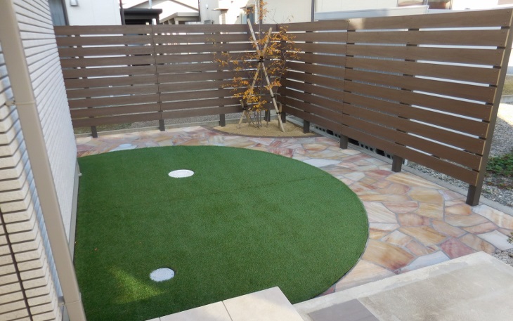隣地2件のお庭と接しているので、板塀(樹脂製利用)で仕切りプライベート性を保ち、床は人工芝と乱形石貼りでアールをデザインしました。