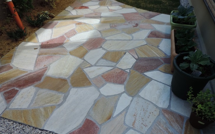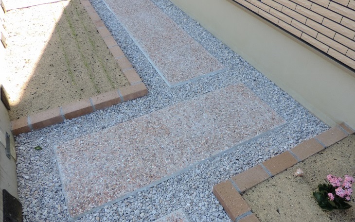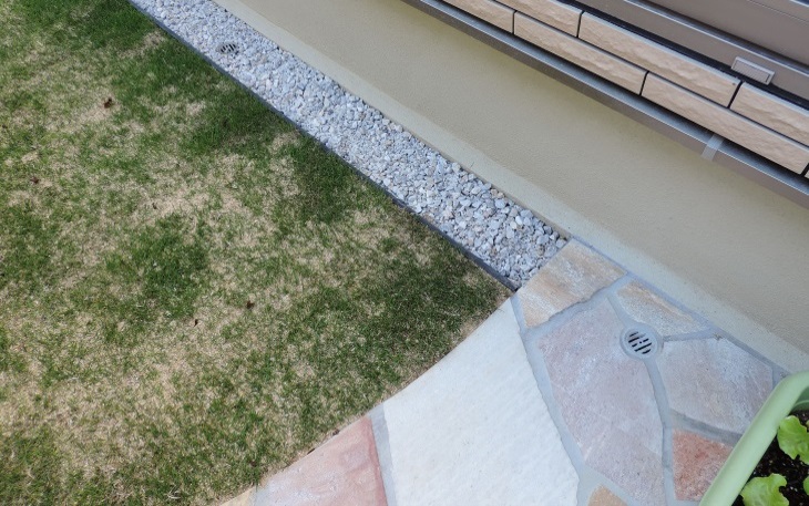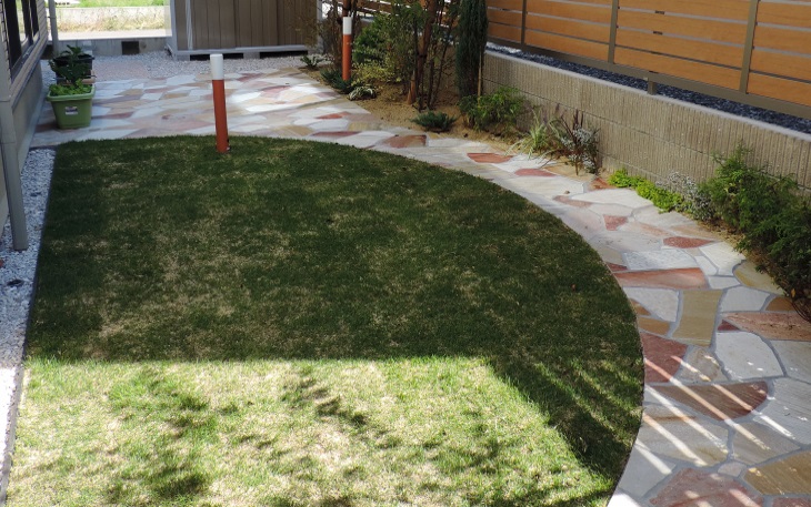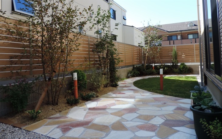 石張りの園路は植栽帯と芝生をソフトに仕切っています
