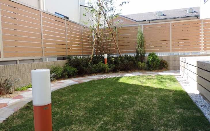 木目の柔らかく明るい色と、植栽、芝生のグリーンが優しくナチュラルな雰囲気になりました