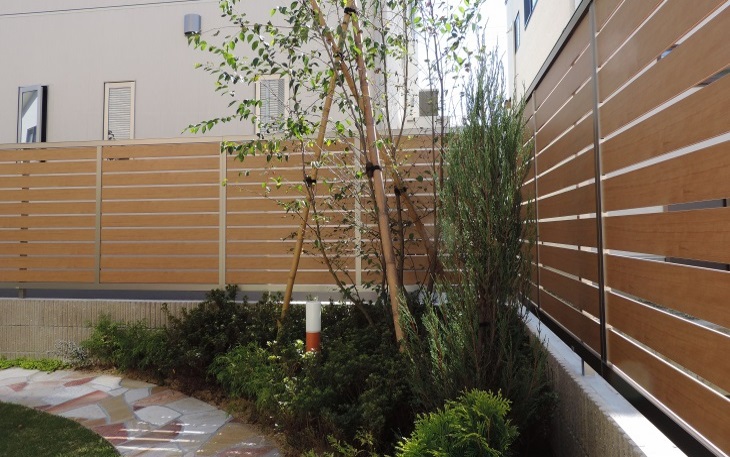 境界は木目調のアルミフェンス LIXIL『セレビューフェンスRP3型』