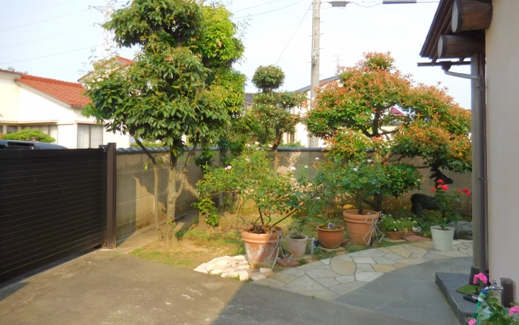 石張りのテラススペースがあったり、バラのプランターがたくさんあったりと、お庭としては十分素敵だったのですが、年々管理が大変になるのでなんとかしたいと広いお庭の管理にお悩みでした