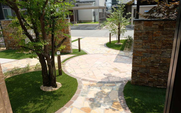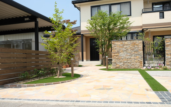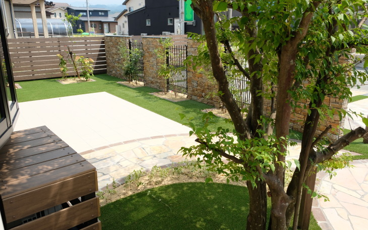 人工芝で防草対策も兼ね お家に合わせたエレガントなエクステリアです。